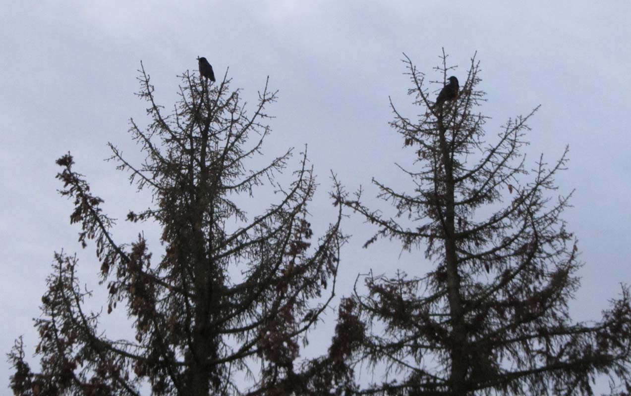 In etwa 20 Metern Höhe über unserem Grundstück haben 2 Raben oder Krähen (das konnte ich nicht so genau erkennen) dann einen Greifvogel attackiert und vertrieben. Sicher auch dem Umstand geschuldet, dass die selbst ein Nest hatten etwas unterhalb den Hang runter zum See im Wald.