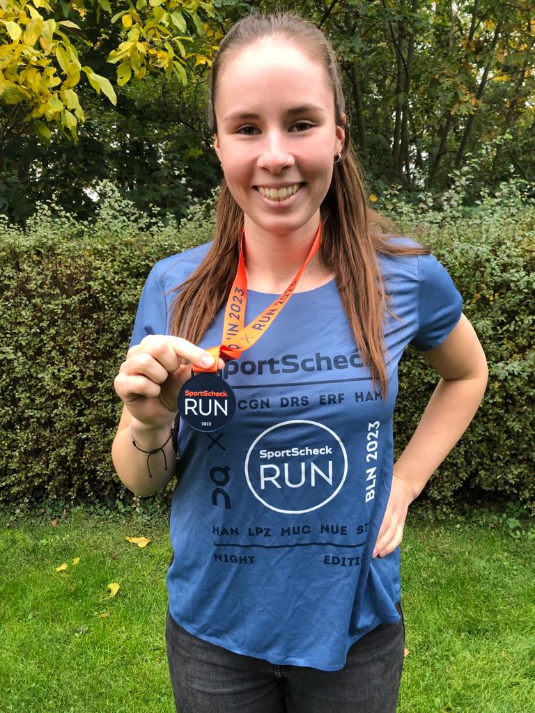Foto: Meike nach dem Lauf, mit dem Laufshirt, bereits wieder umgekleidet.