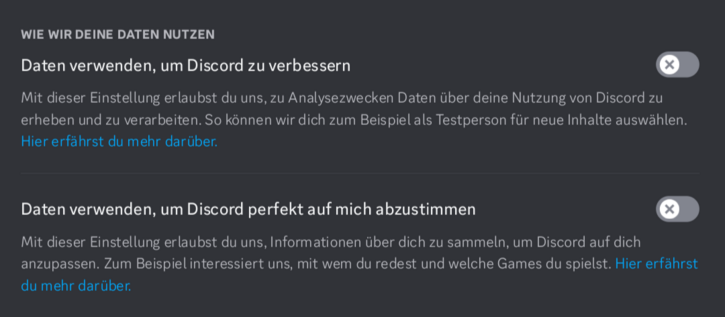 Wenn Du nicht als Trainingsdummy für maschinelles Lernen herhalten möchtest, und dennoch nicht auf Discord verzichten kannst, solltest Du zumindest das Einverständnis zur Nutzung Deiner Daten und Deines Nutzungsverhaltens in den Einstellungen unter "Privatsphäre & Sicherheit" widersprechen.